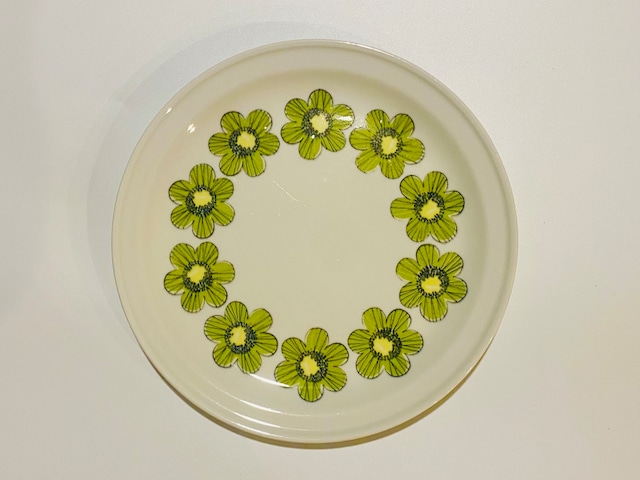 Arabia Primavera プリマヴェーラ プレート23.5cm アラビア社のデザイナー Esteri Tomura(エステリ・トムラ)デザインのPrimavera(プリマヴェーラ)シリーズです。Primaveraは「春」を意味しています。グリーン系のお花が春の爽やかなイメージを表現し、魅力ある繊細なタッチで描かれています。プリマヴェーラをテーブルいっぱいに彩り、華やかなコーディネートを楽しみましょう♬ 状態のご案内 カトラリー跡は多少ありますが大変綺麗なヴィンテージコンディションです。また製造時に生じる凸凹や黒点、焼成時の支え跡が縁と縁周りにあります。裏面バックスタンプ下あたりにラインが見受けられますが、これは素地の少しの段差によるものです、特に問題ないと思います。経年による細かなスレや汚れ、小傷などが多少ありますのでご了承をお願い致します。 サイズ 直径約23.5cm [ご購入の前にご確認ください] 当店で取り扱っている商品は、北欧の一般家庭で実際に使用されていたヴィンテージ品です。目立つ傷や汚れについては出来るだけ商品説明にて記載しておりますが、明記していない経年の劣化や使用に伴う細かなスレや傷、汚れなどがあることもございます。また、当時の北欧の陶磁器に多く見られる焼成時の支え跡があります。新品では味わえない特有の風合いをお楽しみ頂けましたら幸いです。 食器類は日本の食品衛生法に基づき「装飾用」として輸入・販売しております。ご購入の前にあらかじめご了承いただきますようお願いいたします。