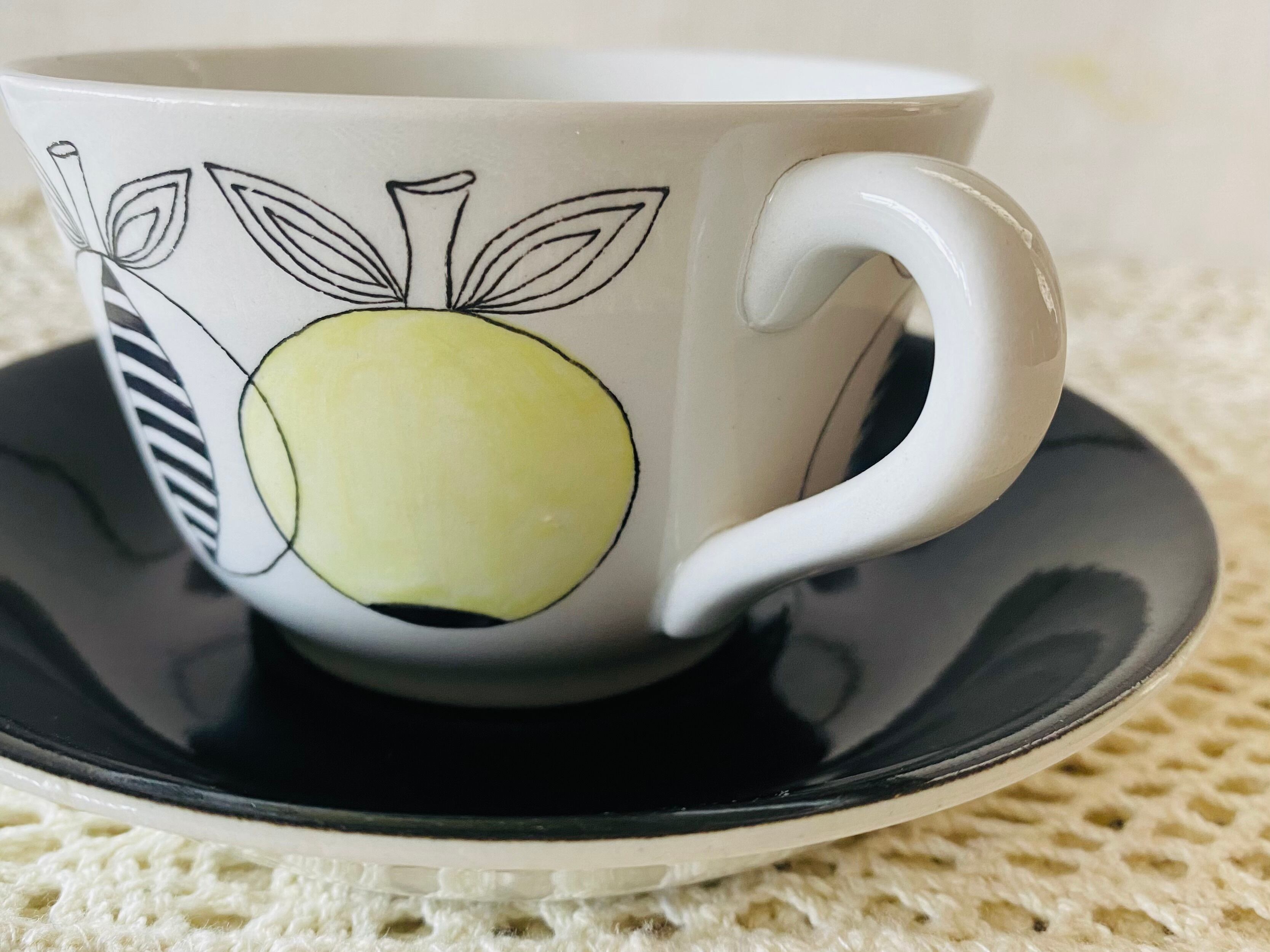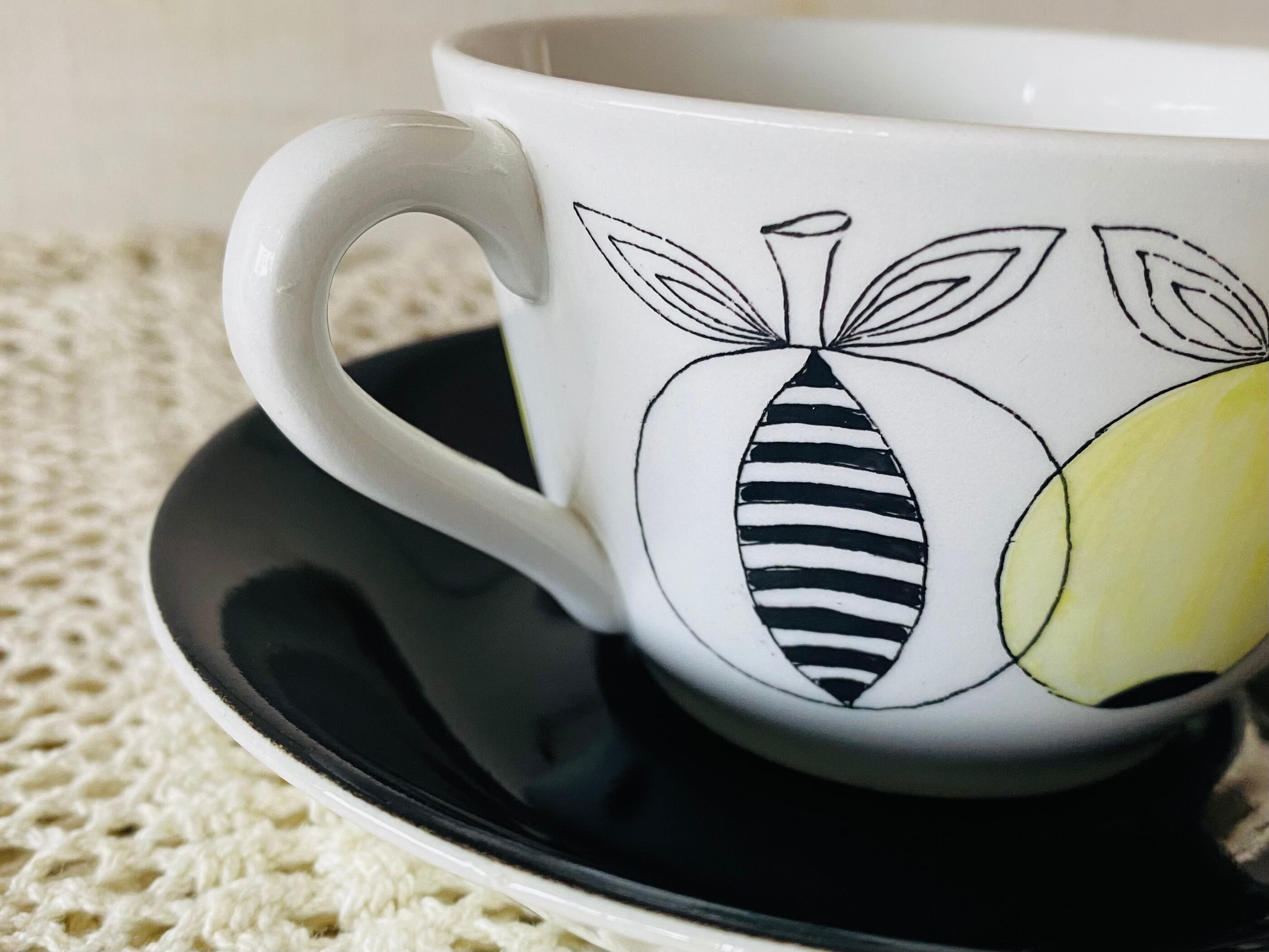 フィンランドの名窯 ArabiaよりとってもレアなPomona カップ&ソーサー レモン柄をご紹介致します。Pomonaシリーズはフルーツが主役の可愛らしいデザインが特徴です。デコレートデザインはEsteri Tomula、フォルムデザインはOlga Osol、1956~1960年製造です。ブラックのラインで表現された可愛らしいレモンにハンドペイントで彩られた爽やかなイエローがテーブルを明るく演出します。