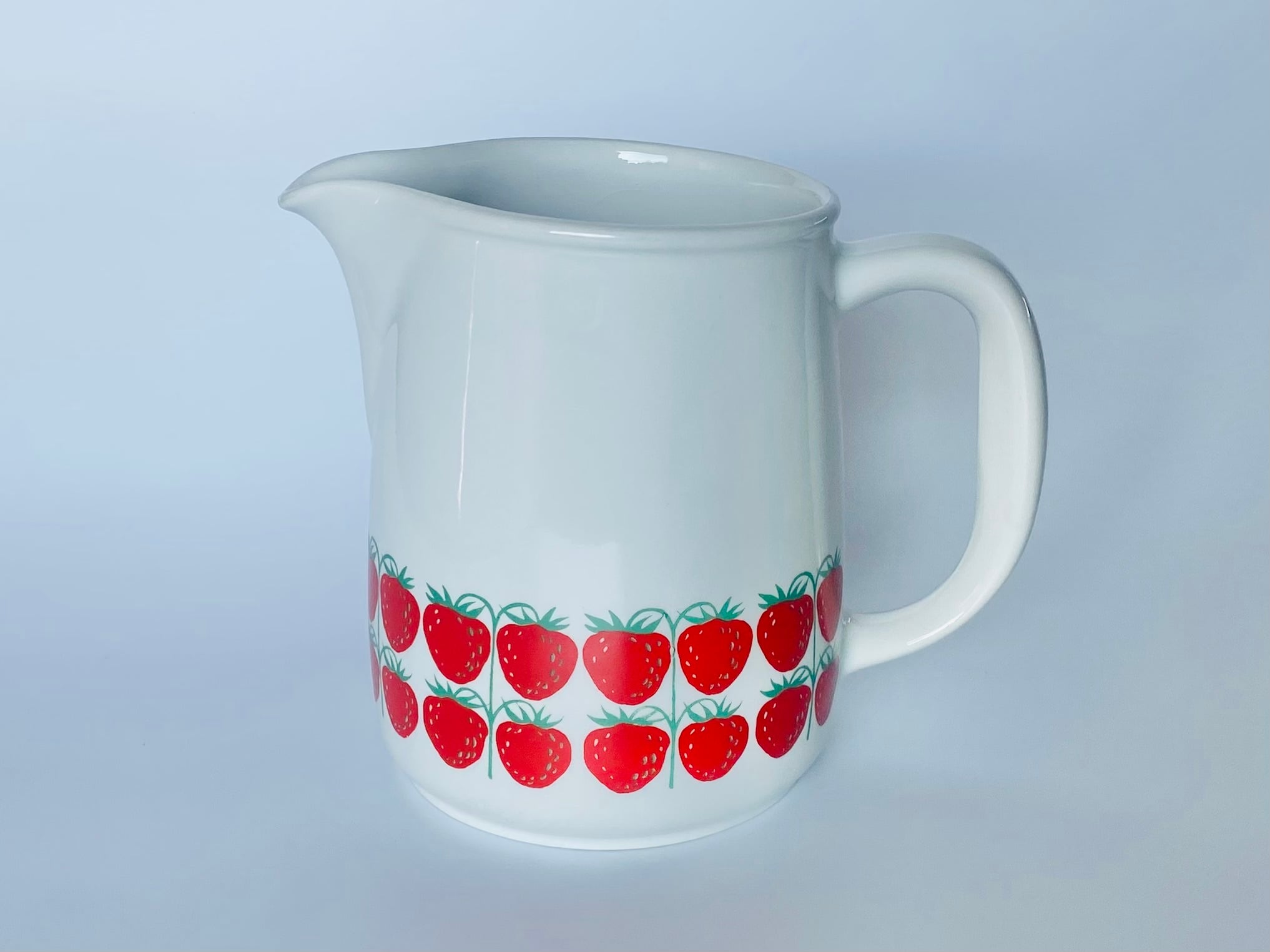 フィンランド Arabia Pomona (ポモナ)シリーズから人気のいちごピッチャーを入荷致しました。cuteな苺が並んでぐるりと描かれています。お飲み物を入れてご使用して頂くのはもちろん、フラワーベース やカトラリー入れなどにしても楽しめます♪