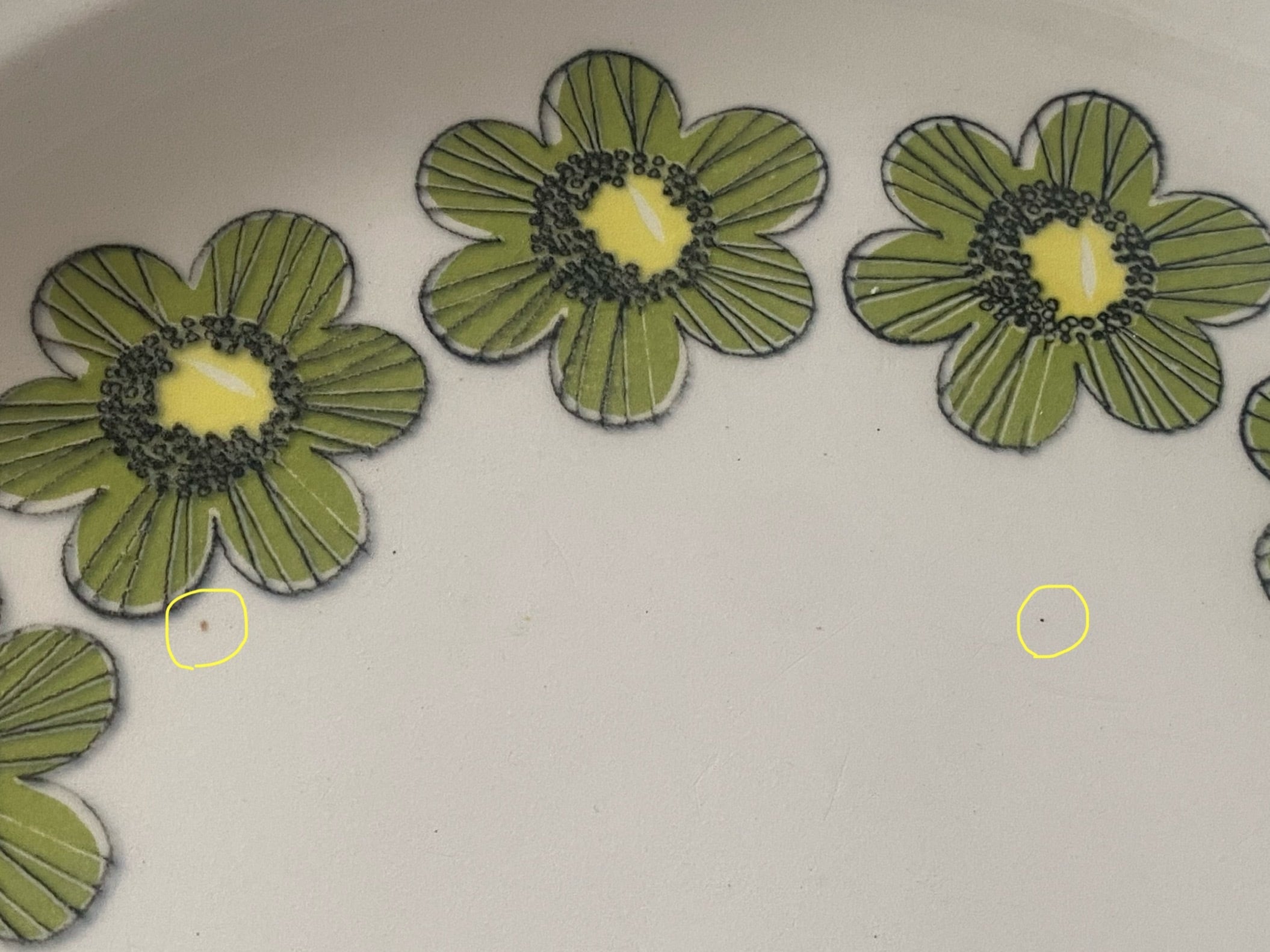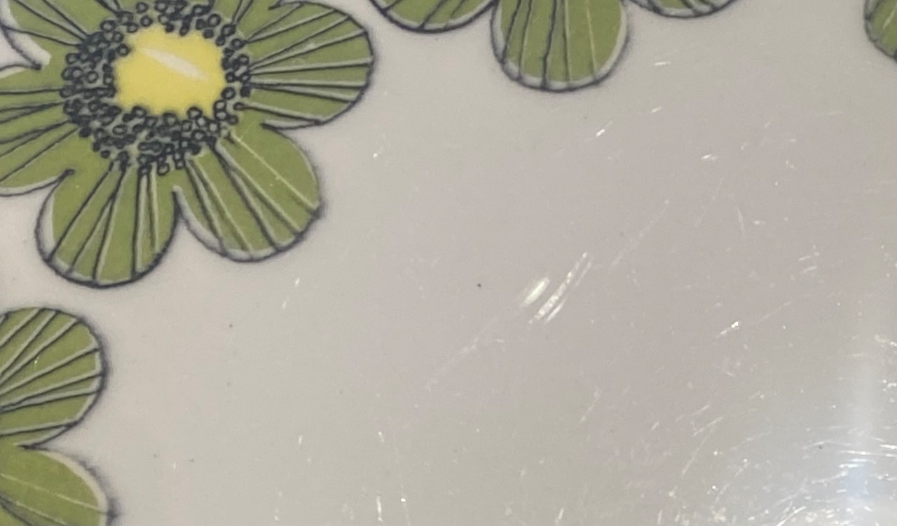 当店で取り扱っている商品は、北欧の一般家庭で実際に使用されていたヴィンテージ品です。目立つ傷や汚れについては出来るだけ商品説明にて記載しておりますが、明記していない経年の劣化や使用に伴う細かなスレや傷、汚れなどがあることもございます。また、当時の北欧の陶磁器に多く見られる焼成時の支え跡があります。新品では味わえない特有の風合いをお楽しみ頂けましたら幸いです。