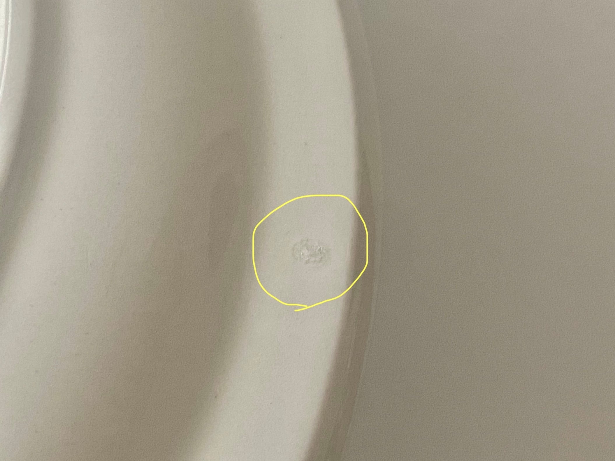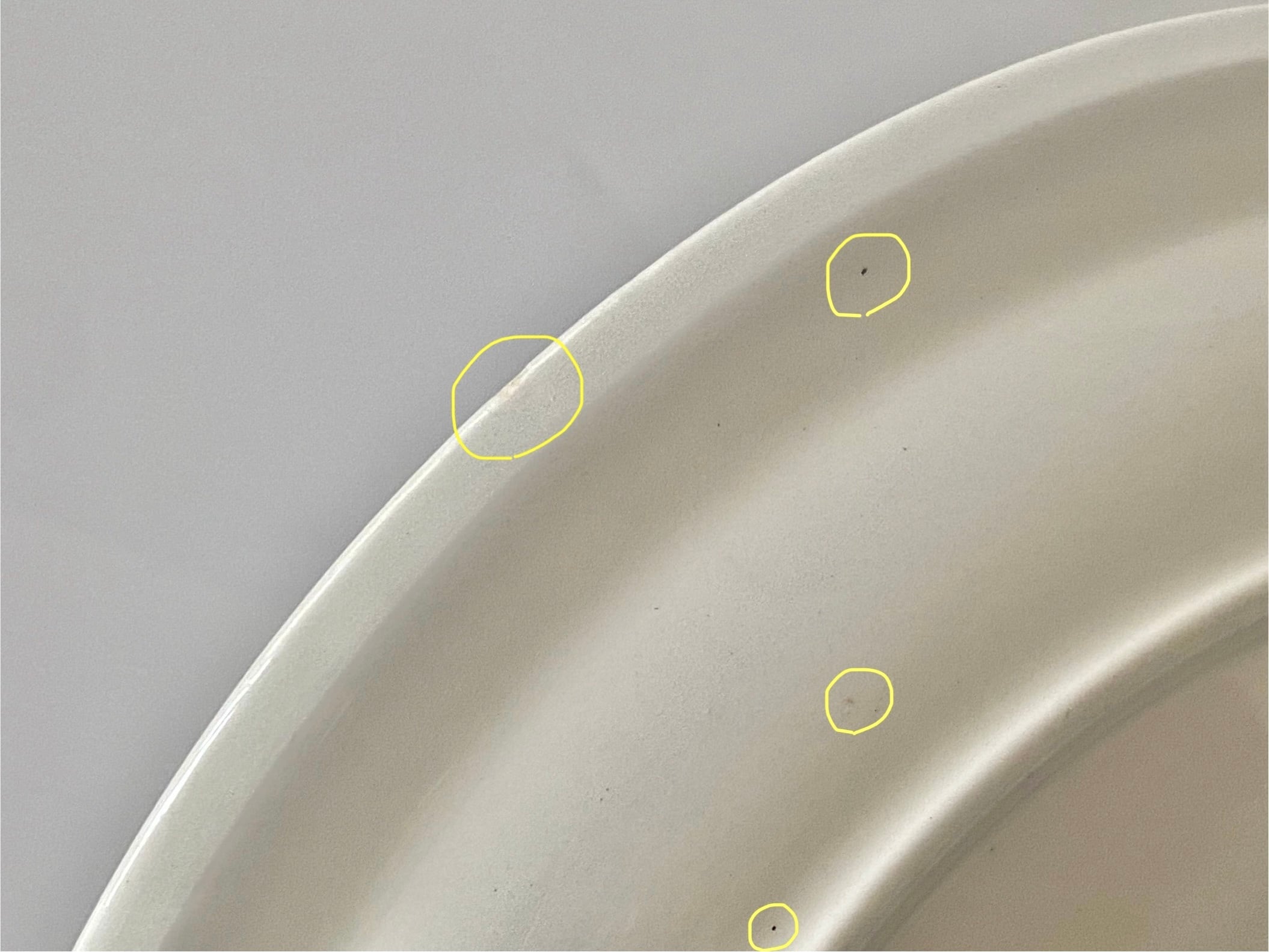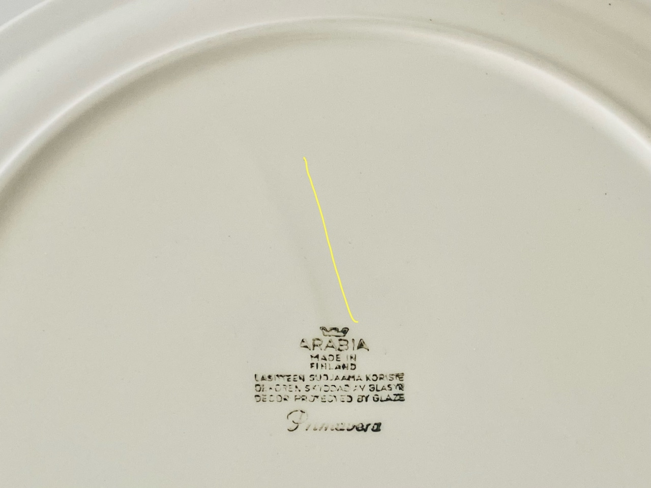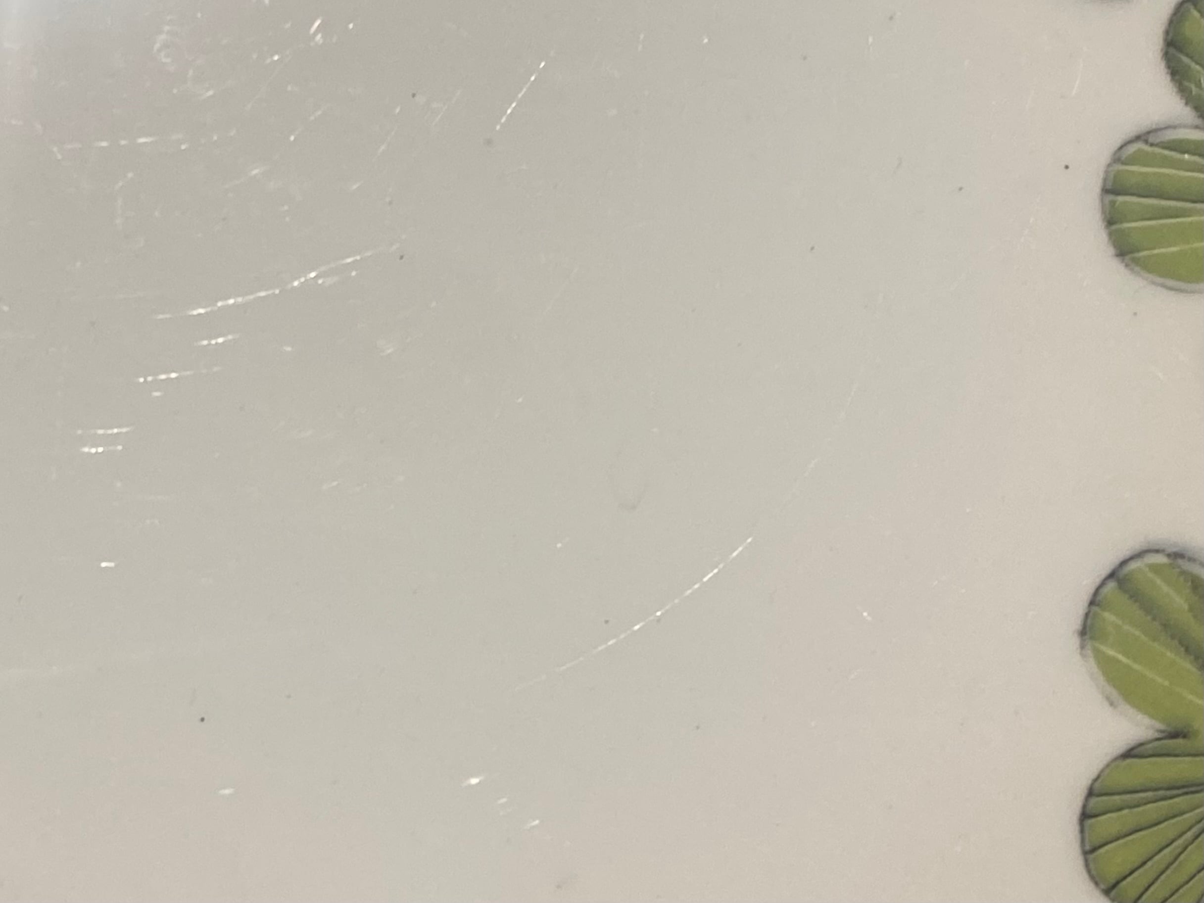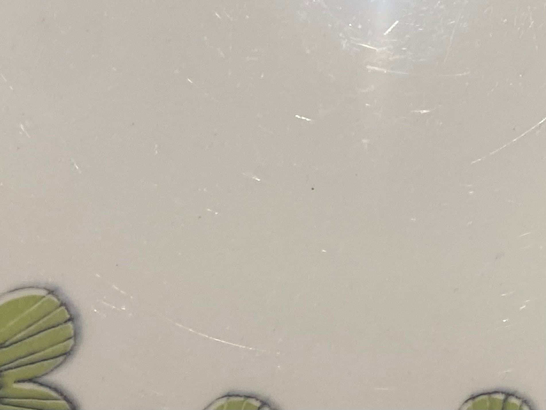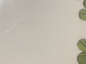 カトラリー跡は多少ありますが大変綺麗なヴィンテージコンディションです。また製造時に生じる凸凹や黒点、焼成時の支え跡が縁と縁周りにあります。裏面バックスタンプ上あたりにラインが見受けられますが、これは素地の少しの段差によるものです、特に問題ないと思います。経年による細かなスレや汚れ、小傷などが多少ありますのでご了承をお願い致します。