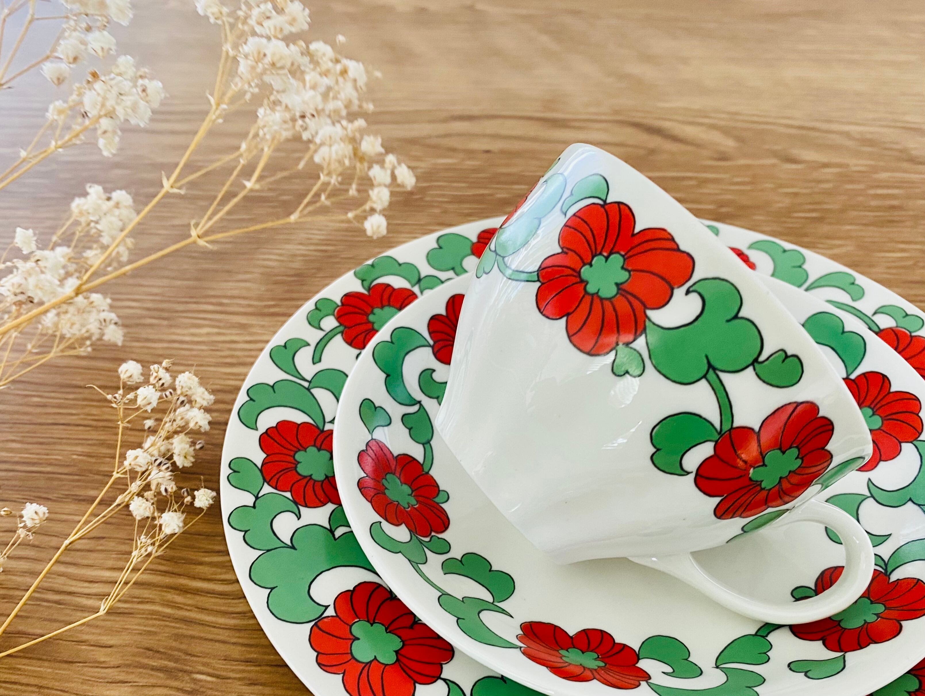 Arabia Petunia(ペチュニア)シリーズからレッドカラーの3 piece setのご紹介です。鮮やかなペチュニアのお花と葉のグリーンが華やかにデザインされていて大変美しいです。フォルムはKaj Franck(カイ・フランク)による"OZモデルで、少し波打つクラシカルなデザイン。カラー展開は2色で、イエロー&グリーンもあります。1970年代前半に製造された大変希少なシリーズです。