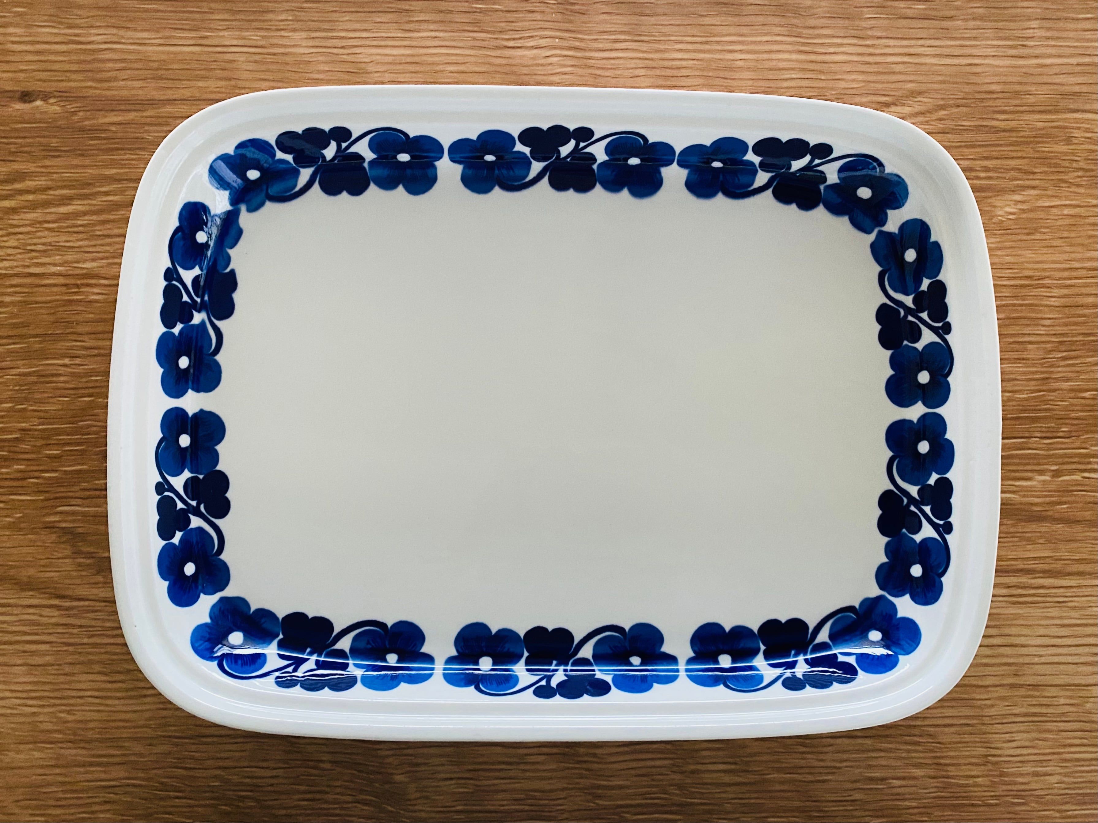 アラビア社のデザイナー Esteri Tomura(エステリ・トムラ)さんデザインのAamu(アアム)大きなスクエアプレートです。「Aamu」は「朝」を意味しており、濃い美しいブルーのお花が爽やかな朝を表現しています。スクエアプレートは大変珍しく入手困難なレアアイテムです。