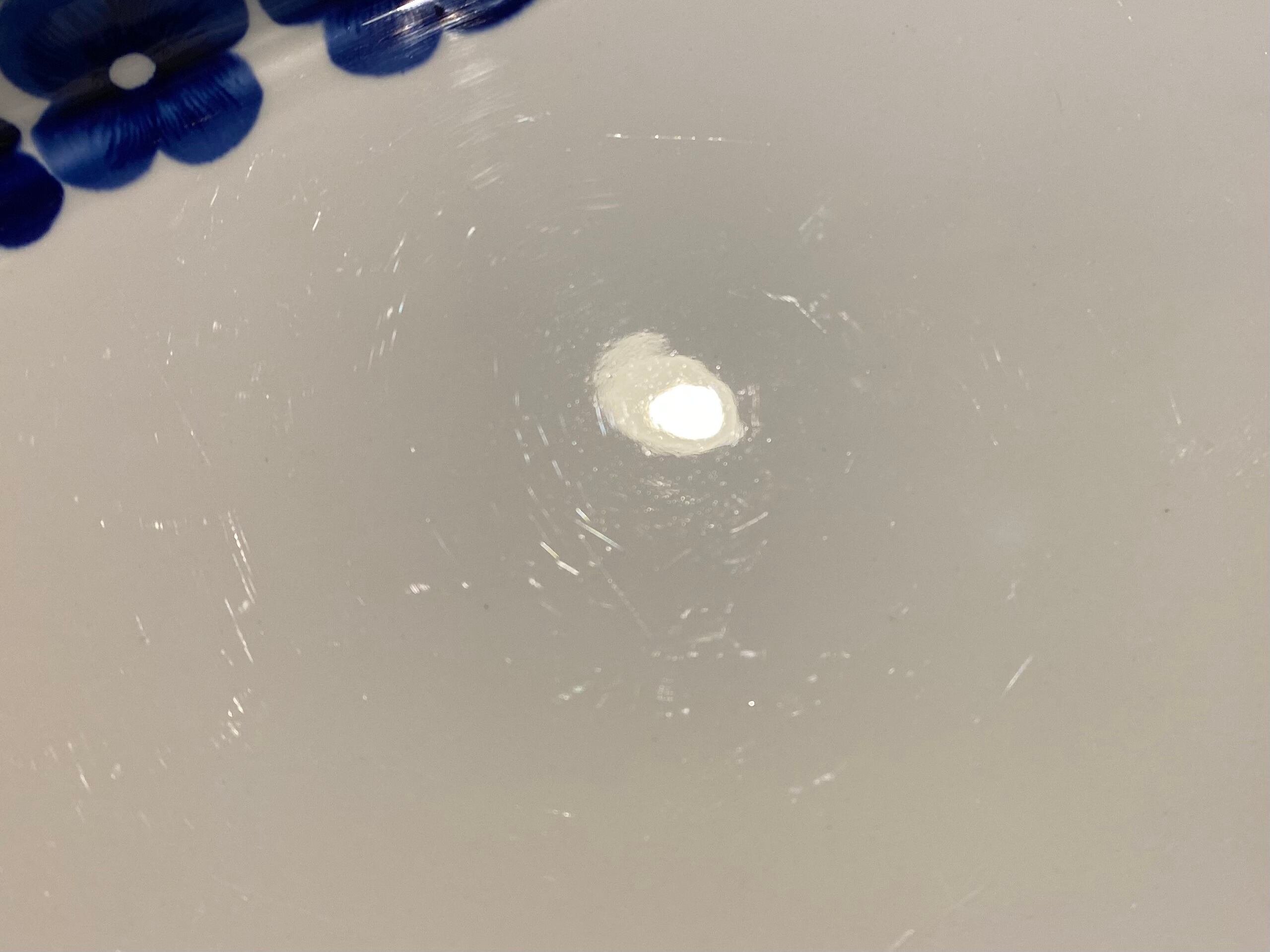 光を当てると細かい擦れやカトラリー傷が見受けられますが、艶があり絵柄も綺麗に保たれています。経年による細かなスレや汚れ、小傷などがあります。製造時に生じる凸凹や黒点、焼成時の支え跡が数点あります。カケやヒビはなくヴィンテージコンディションは大変良好です。