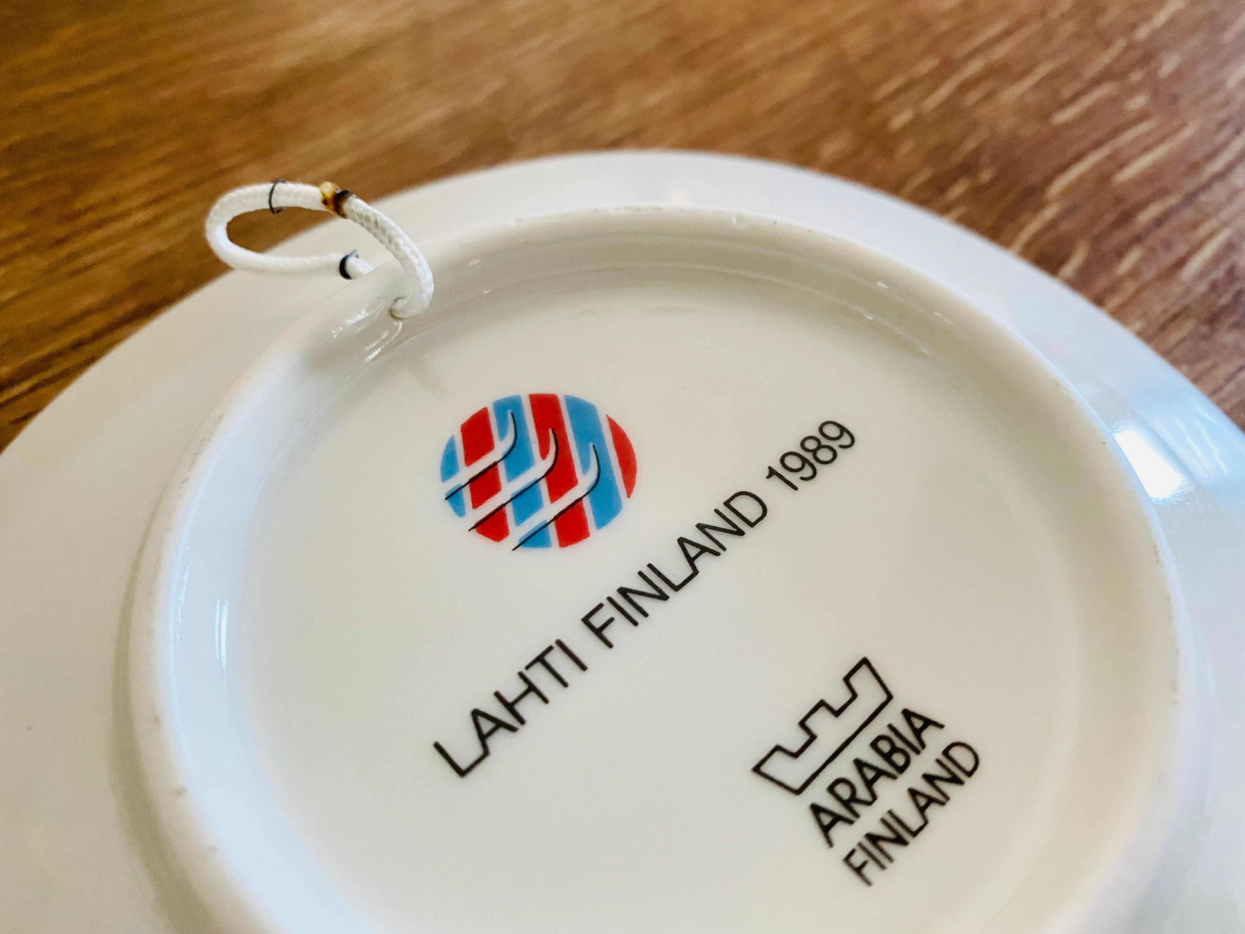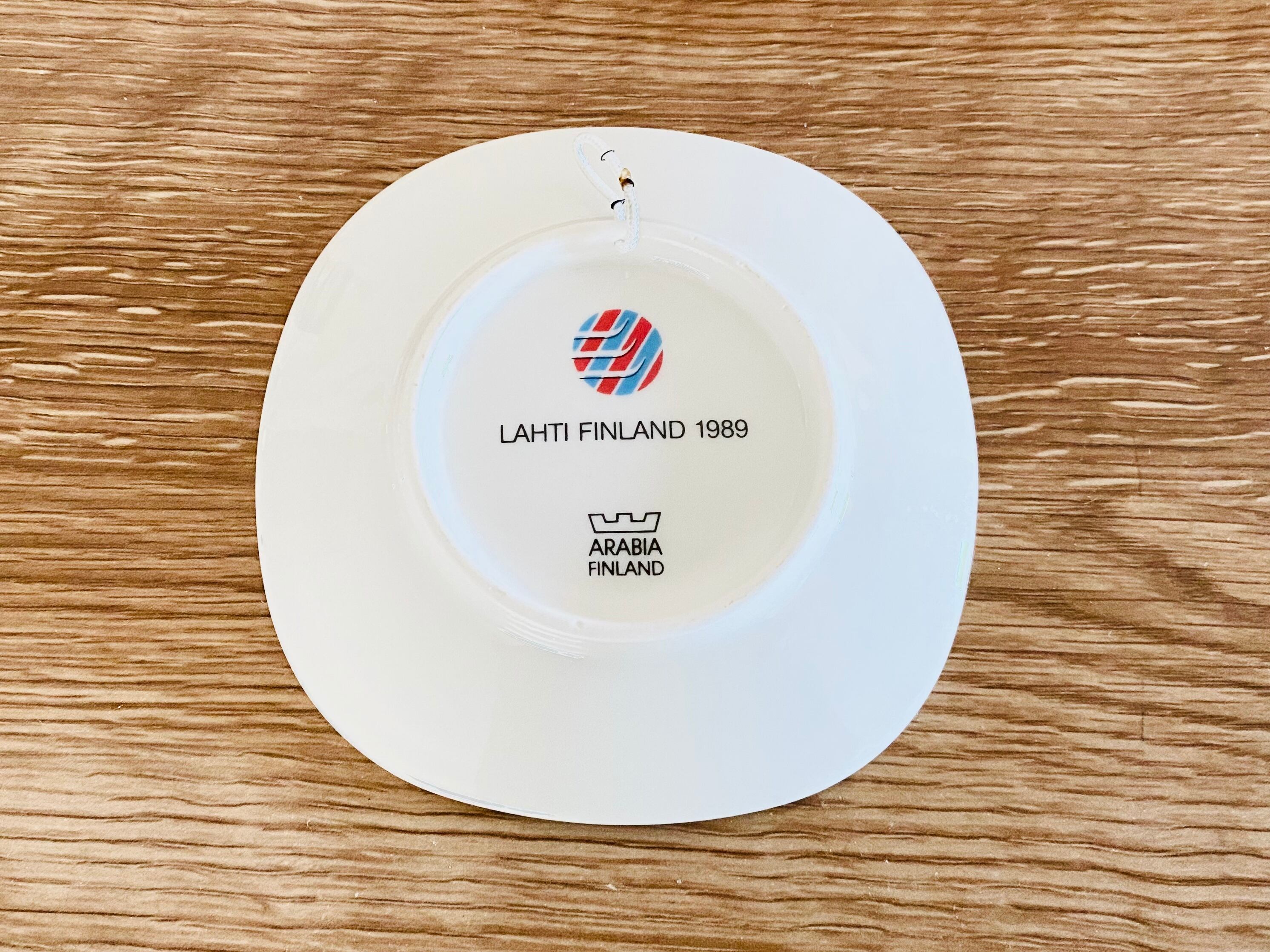 1989年、フィンランド・Lahti(ラハティ)で行われましたスキー世界選手権の開催記念で制作されましたウォールプレートです。とってもキュートなサンタさんがスキーを楽しんでいる様子が描かれています。