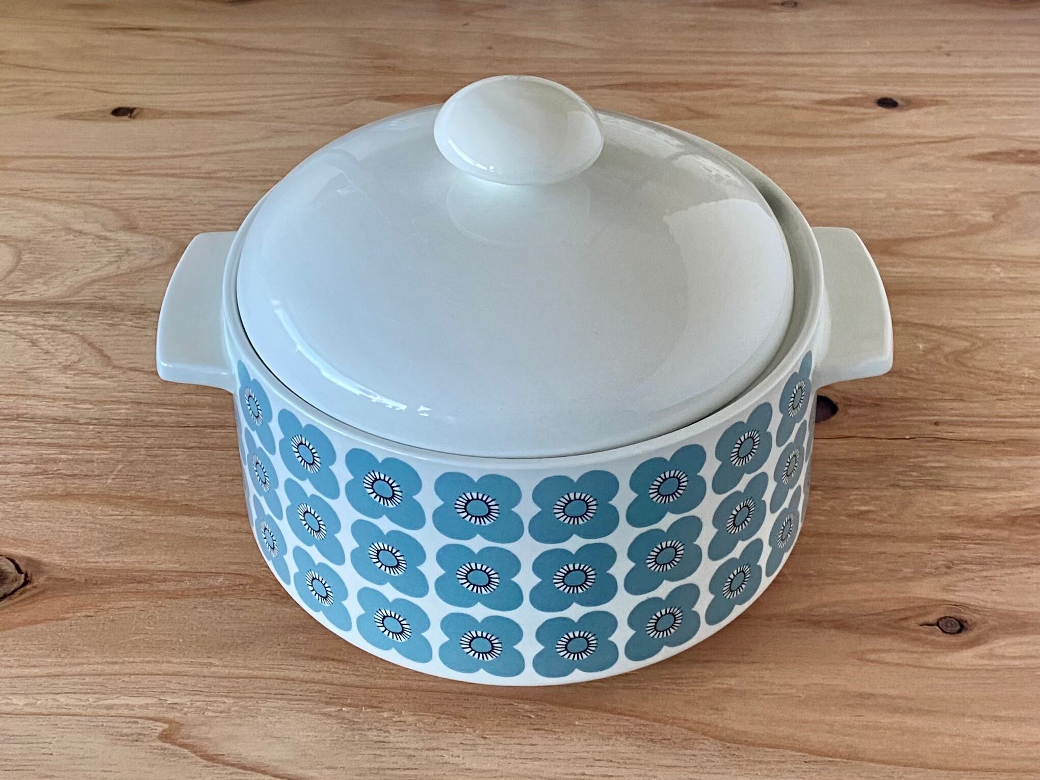 Arabia Veera シリーズ からキャセロールのご紹介です。デザインはお花をモチーフにした作品が有名なEsteri Tomula(エステリ・トムラ)さんです。ナチュラルなブルーグレーカラーの可愛らしいお花たちが規則正しく並んでいます。現在、かなり入手困難なアイテムです。素晴らしいコンディションですので、お探しの方は是非ご検討ください。