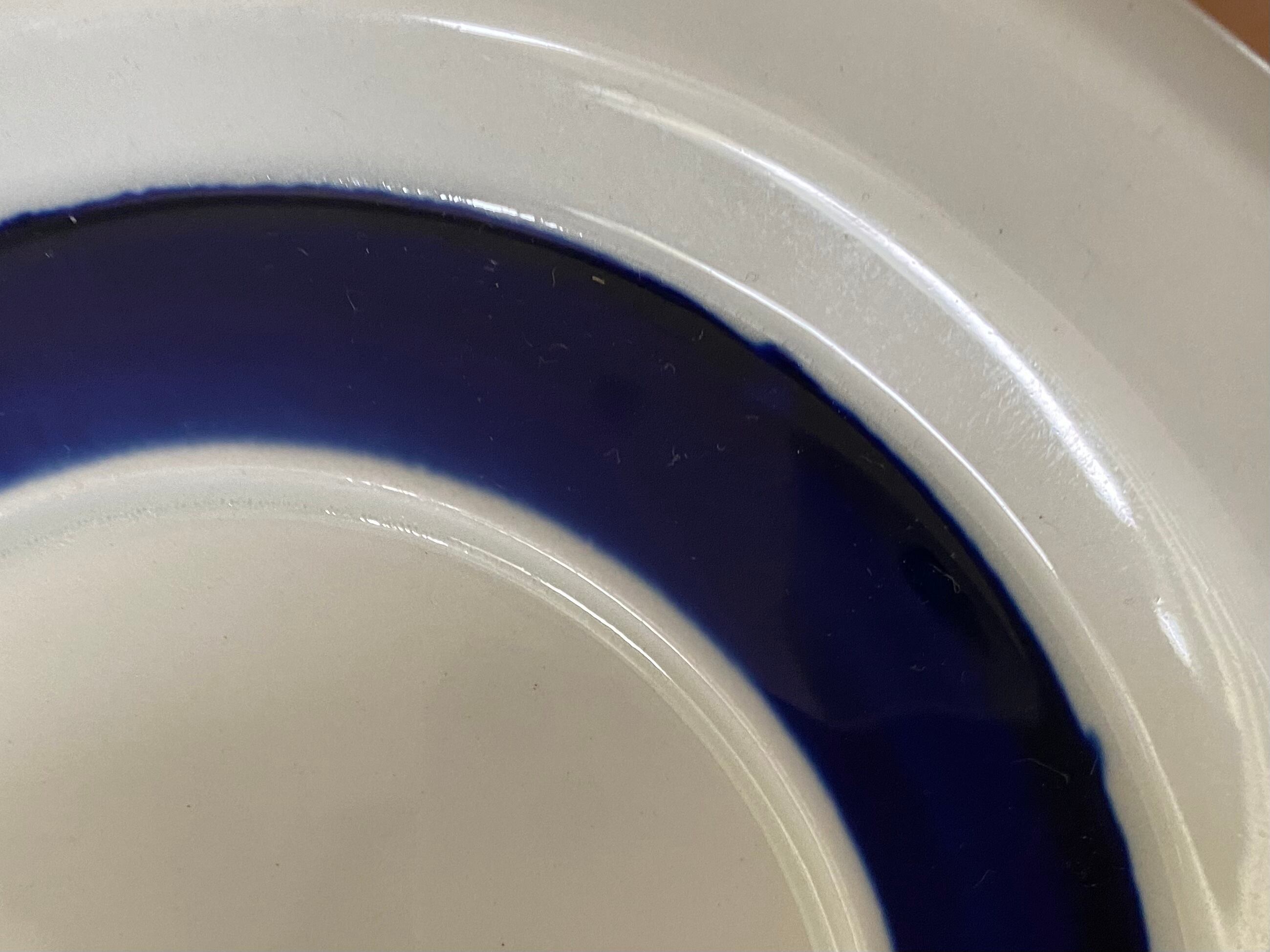 ソーサー表面のブルーラインの装飾が少し雑な部分があります。また、縁と裏面に着色(線状)があります。製造時に生じた焼成時の支え跡があります。経年による細かなスレや汚れなどはご了承ください。全体的に大変良好なヴィンテージコンディションです。