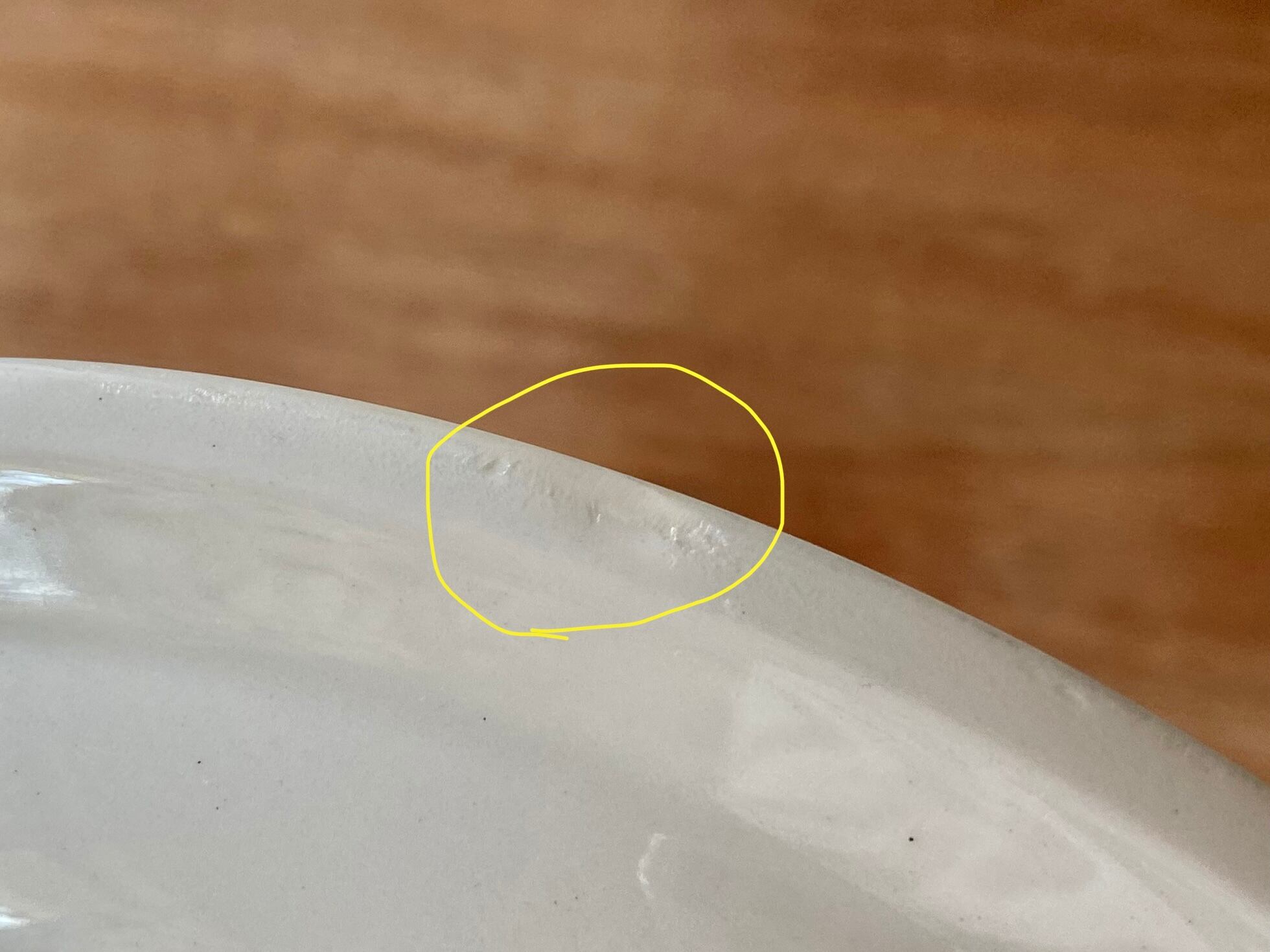 カトラリー跡が少なく艶があり大変良好なヴィンテージ コンディションです。経年による細かなスレやシミ汚れ、小傷などが多少あります。また、製作時に生じた針先程度の黒点や凸凹、焼成時の支え跡が裏面の縁にあります、カケやスレではありません。裏面ですが、素地の多少の段差によって筋が出来ています。ヒビではありません。