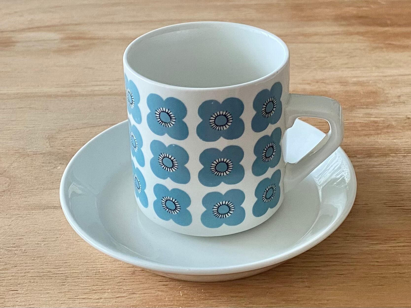 Arabia Veera シリーズ カップ&ソーサーです。デザインはお花をモチーフにした作品が有名なEsteri Tomula(エステリ・トムラ)です。ソフトなブルーグレーカラーの可愛らしいお花たちが規則正しく並んでいます。大変入手困難なアイテムです。
