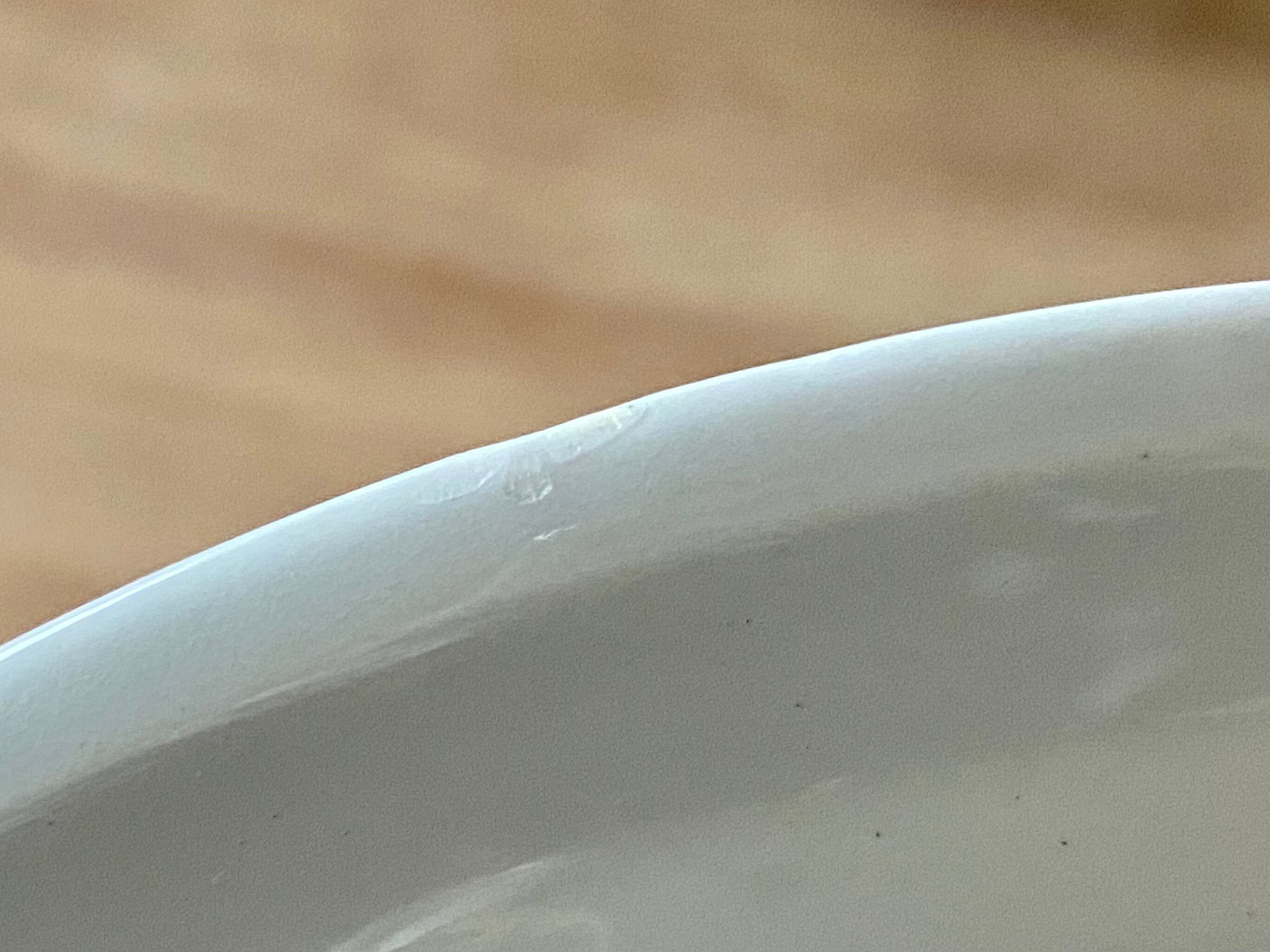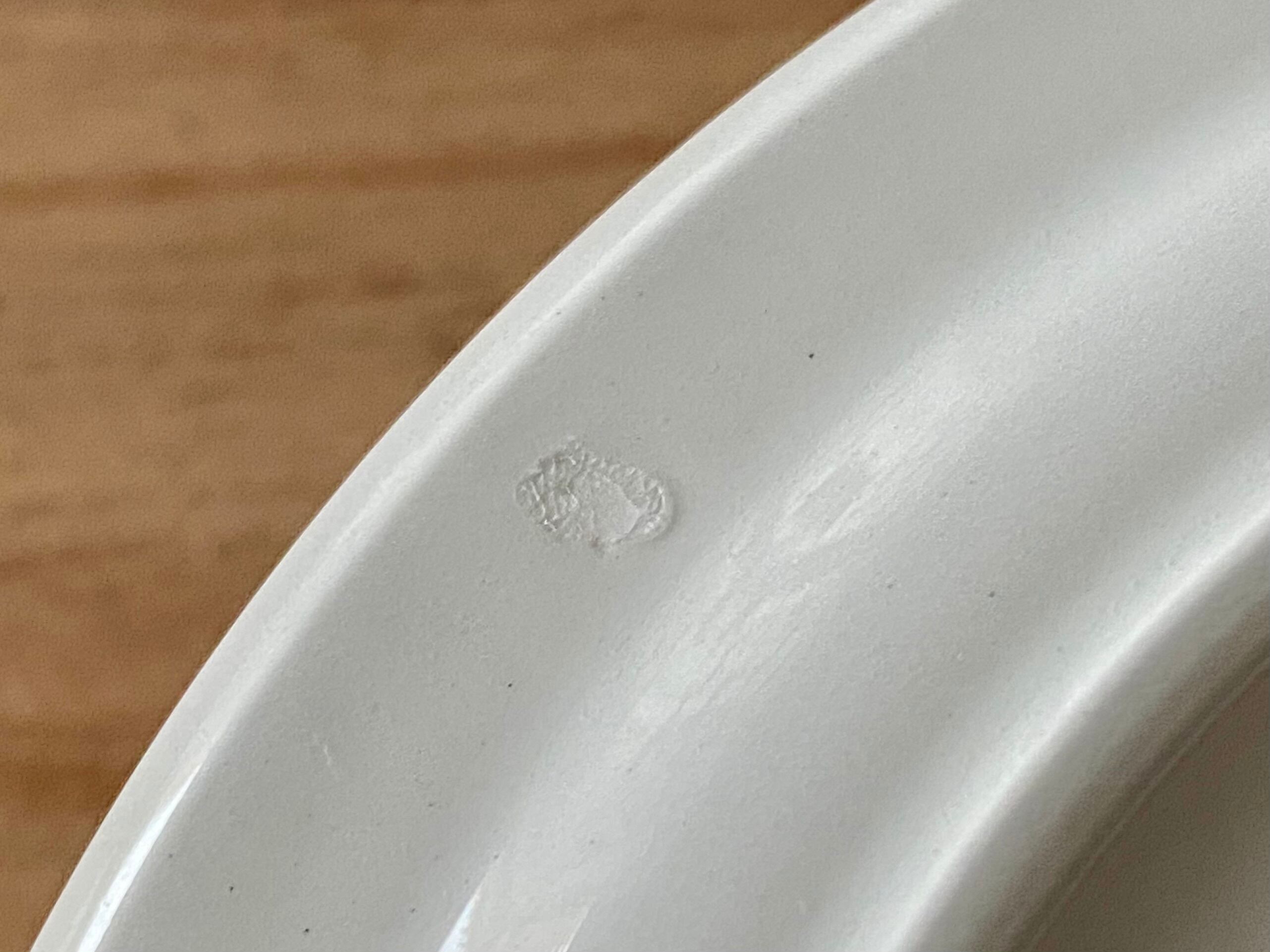 カトラリー跡がほとんど見受けられず大変綺麗なヴィンテージコンディションです。絵柄が少しボケている部分があります。経年による細かなスレや汚れ、小傷などが多少あります。また、製造時に生じる凸凹や黒点、焼成時の支え跡が縁と縁周りにあります。ヴィンテージコンディションは大変良好です。