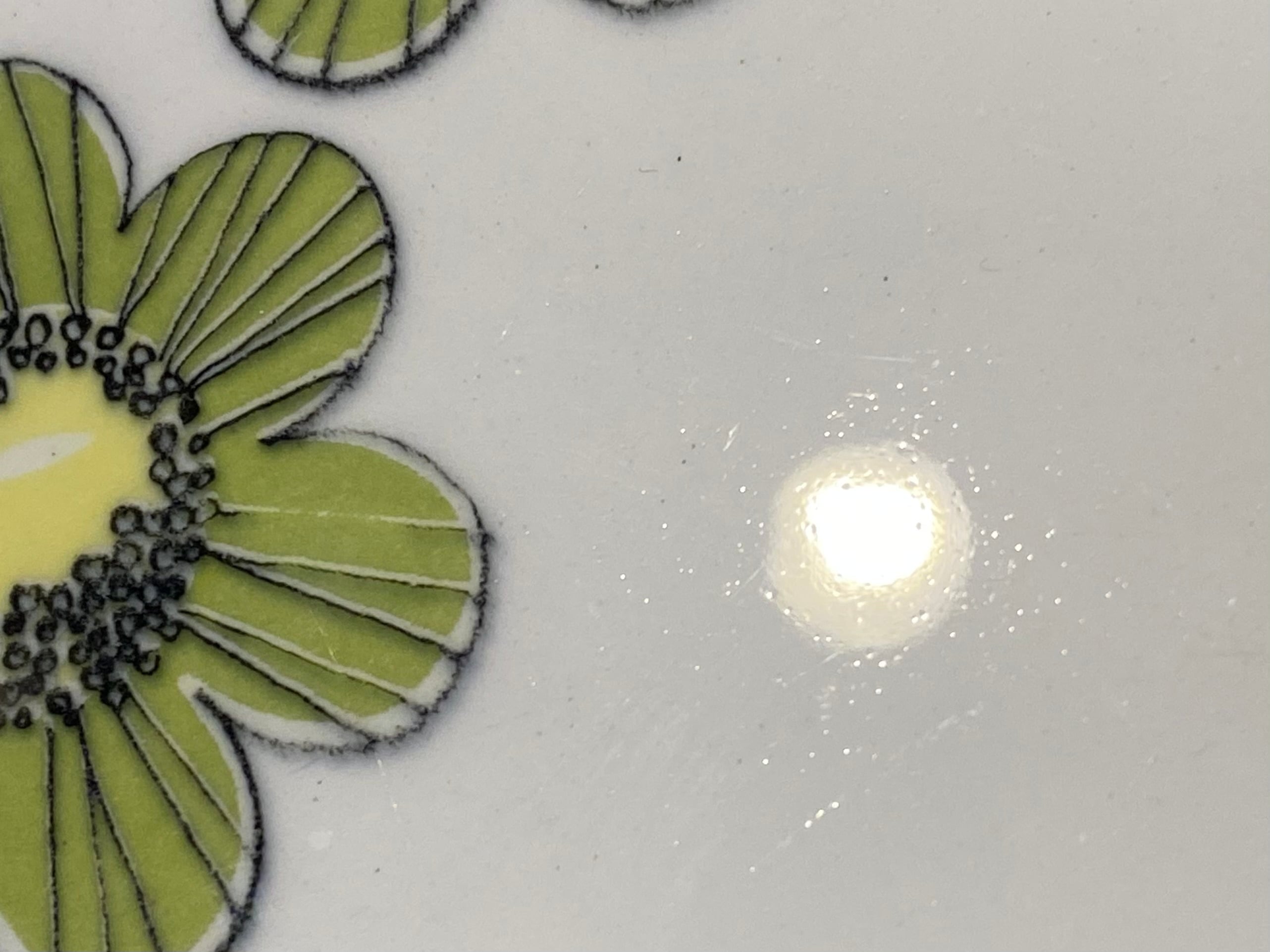 当店で取り扱っている商品は、北欧の一般家庭で実際に使用されていたヴィンテージ品です。目立つ傷や汚れについては出来るだけ商品説明にて記載しておりますが、明記していない経年の劣化や使用に伴う細かなスレや傷、汚れなどがあることもございます。また、当時の北欧の陶磁器に多く見られる焼成時の支えの跡があります。新品では味わえない特有の風合いを楽しんで頂けたら幸いです。