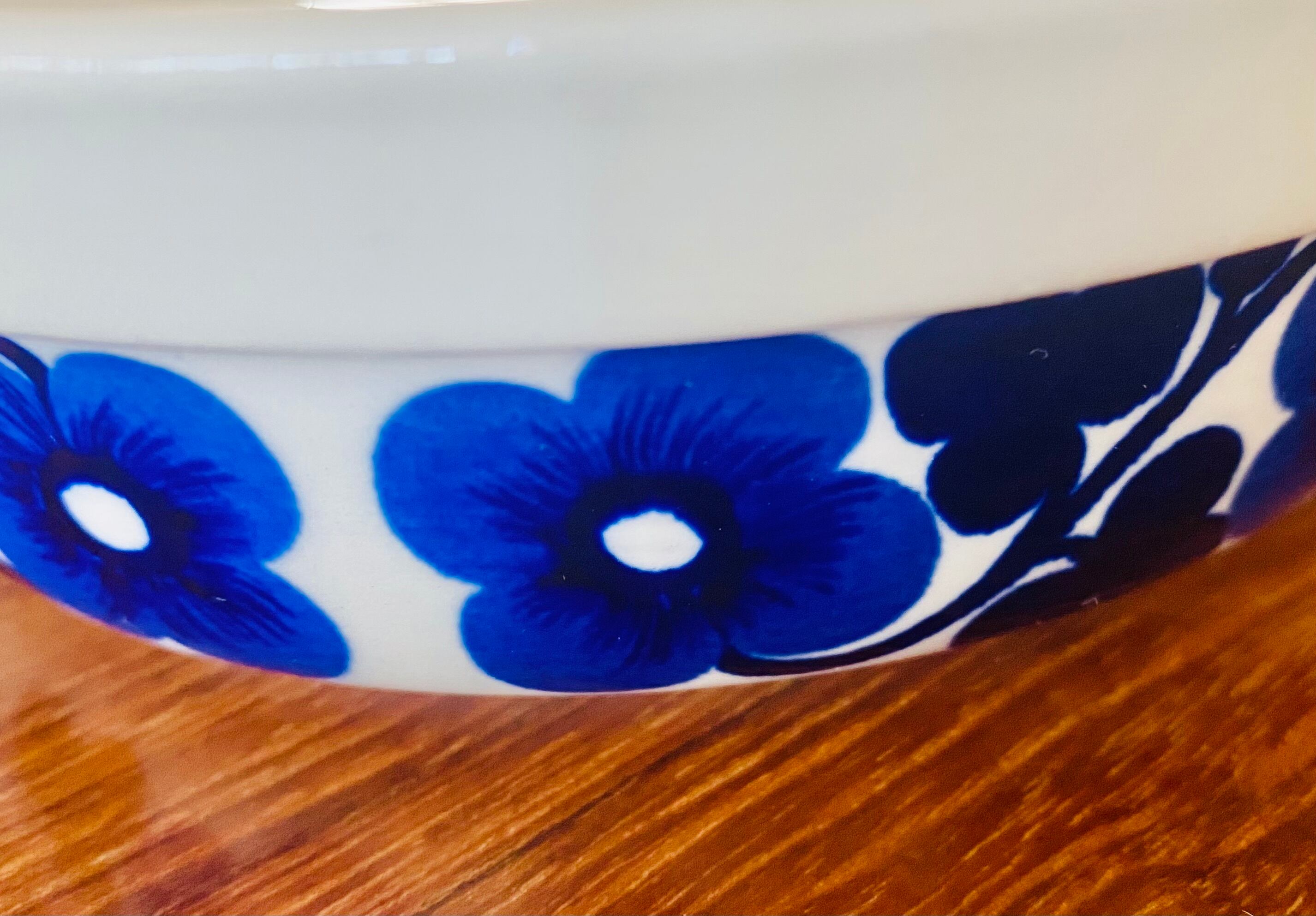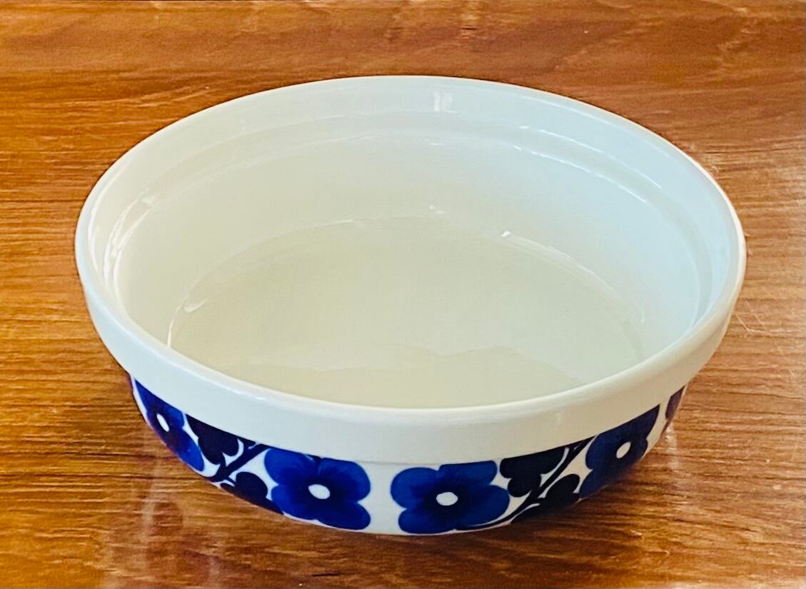 Arabia Aamu(アアム) シリーズ ボウルのご紹介です。デザインはお花をモチーフにした作品が有名なEsteri Tomula(エステリ・トムラ)。美しい深みある藍色の可愛らしいお花たちが白地に引き立っています。Aamuとはフィンランド語で「朝」という意味があります。きっと爽やかな朝に咲き誇り、人々の気持ちを元気に彩ってくれるのでしょう。