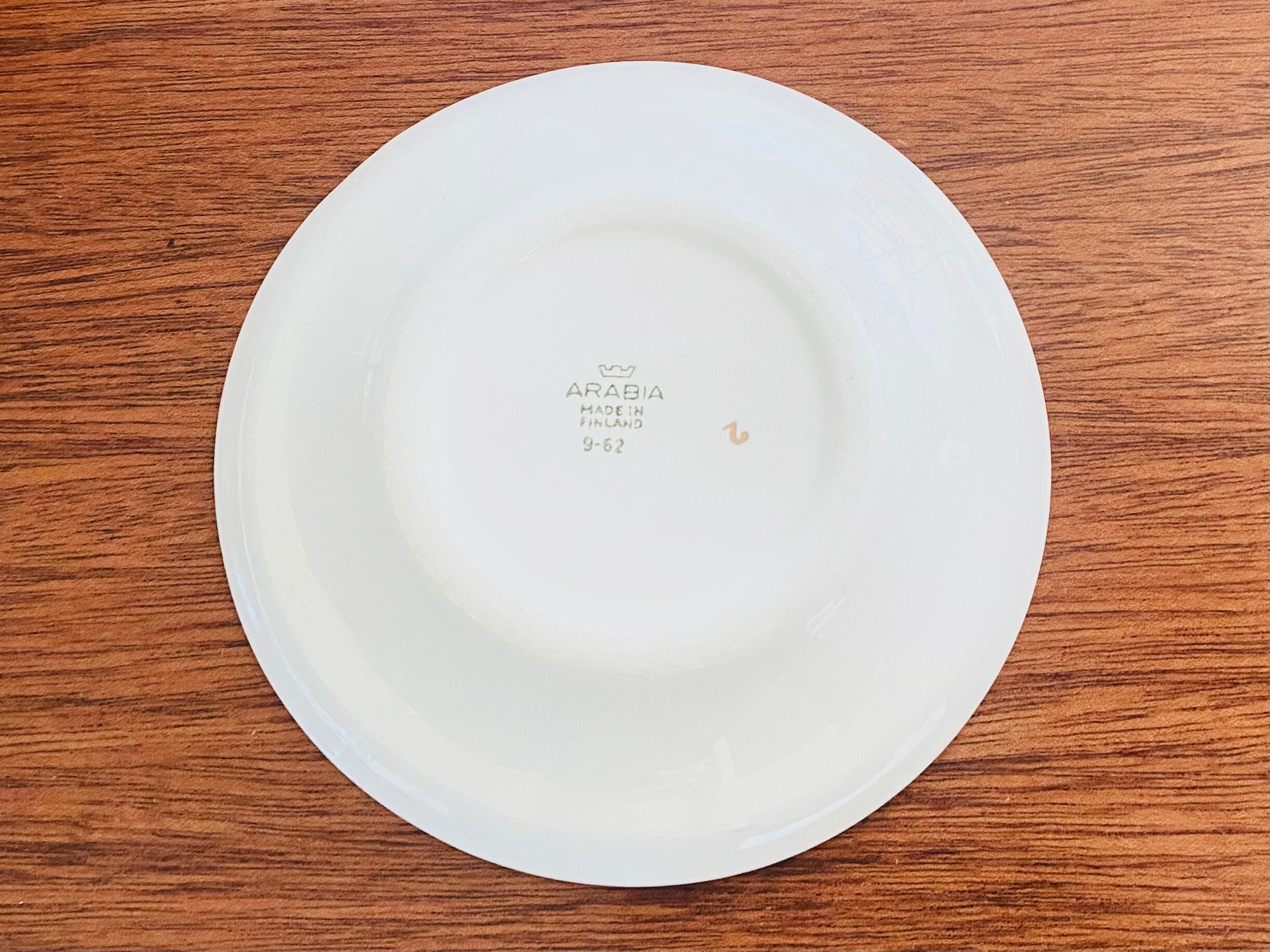 カップ底に極小の突起があります。プレート表面にカトラリー跡や細かなスレ、縁に釉薬の跡が見受けられます。裏面には焼成時の支え跡と数字の「2」のマークが付いています。経年による擦れや汚れなどがあります。また、製造時に生じる凸凹や黒点など目立たない細かい点については明記しておりませんのでご了承お願い致します。全体的にヴィンテージコンディションは大変良好です。