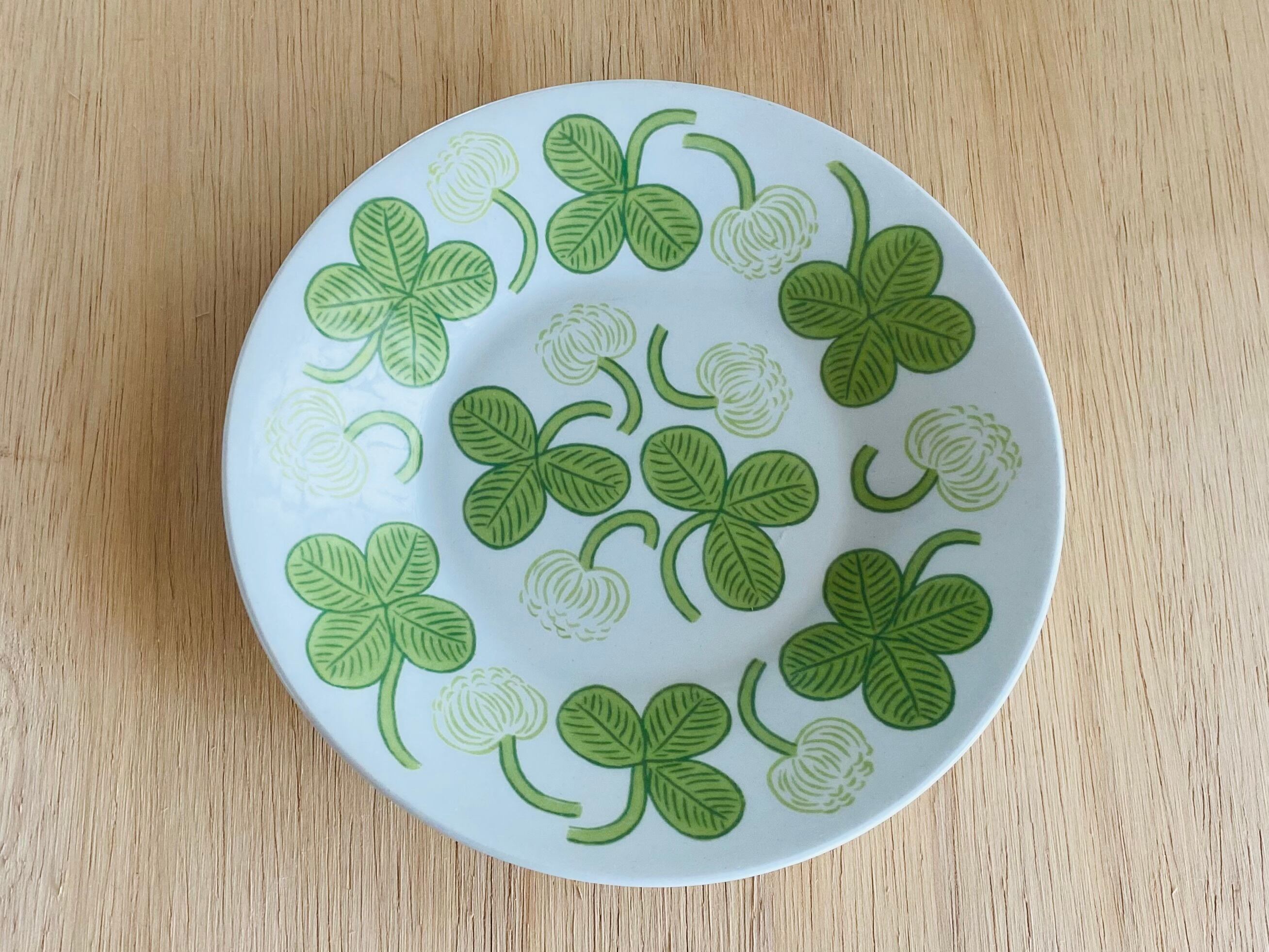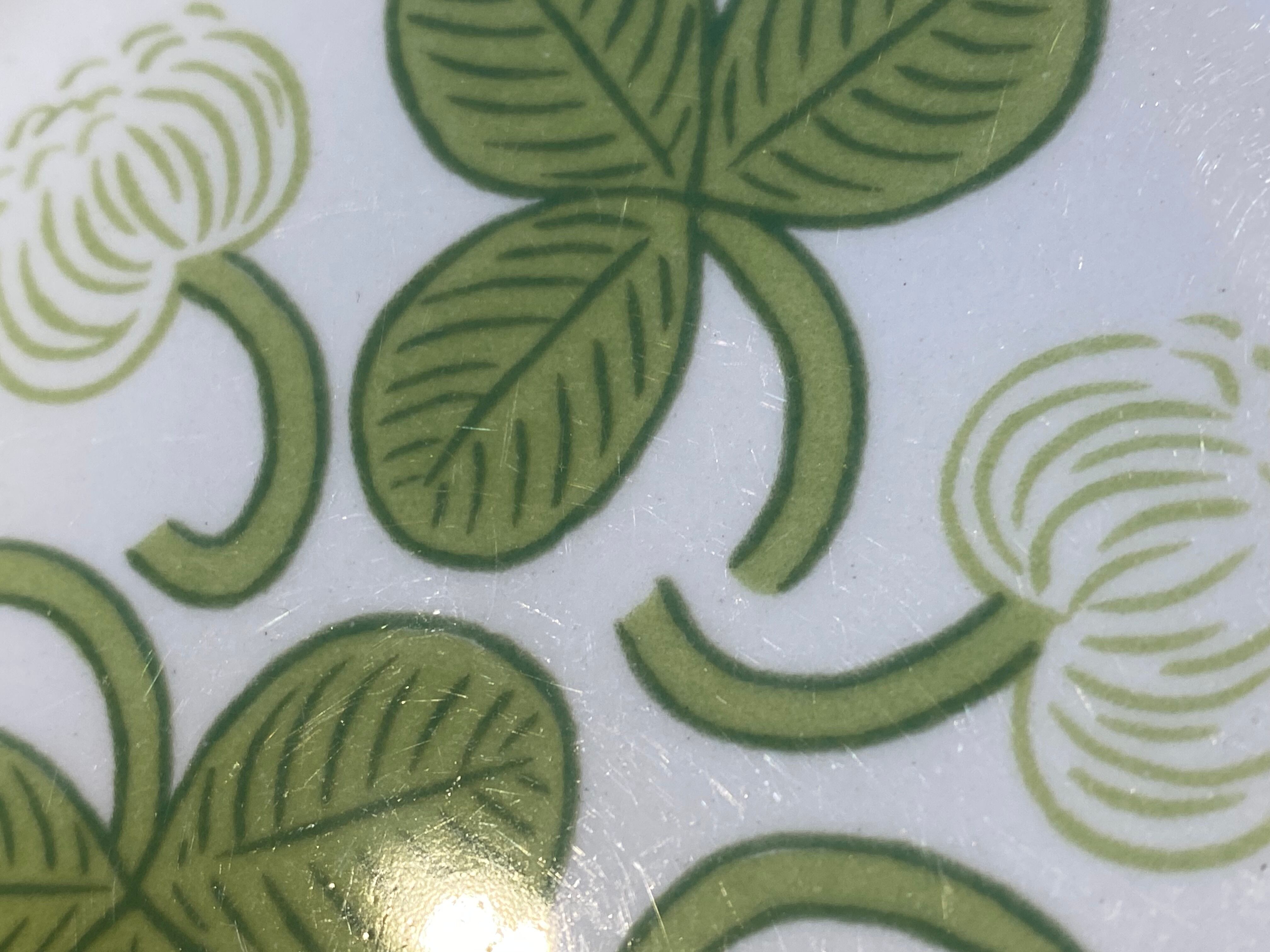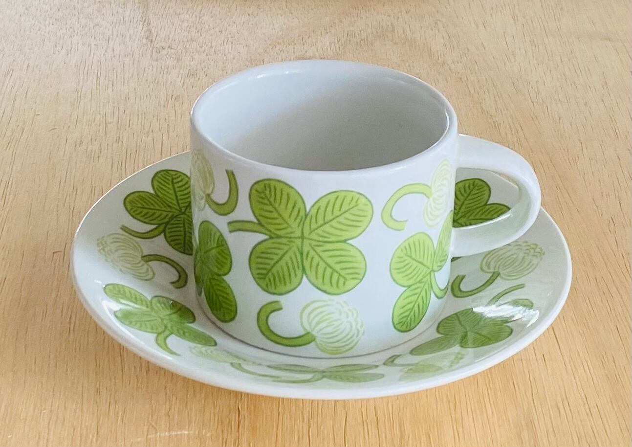 Arabia(アラビア)社のデザイナー Birger kaipiainen(ビルガー・カイピアイネン)がフォルムデザイン、デコレートデザイン共に手掛けた人気作品「Apila」。アラビア食器の中では屈指の人気シリーズで、日本ではもちろん世界中に多くのファンがいます。さわやかな緑のクローバーが大胆にデザインされ、とっても明るい気持ちにさせてくれます。こちのお品はヴィンテージです。復刻版ではありません。