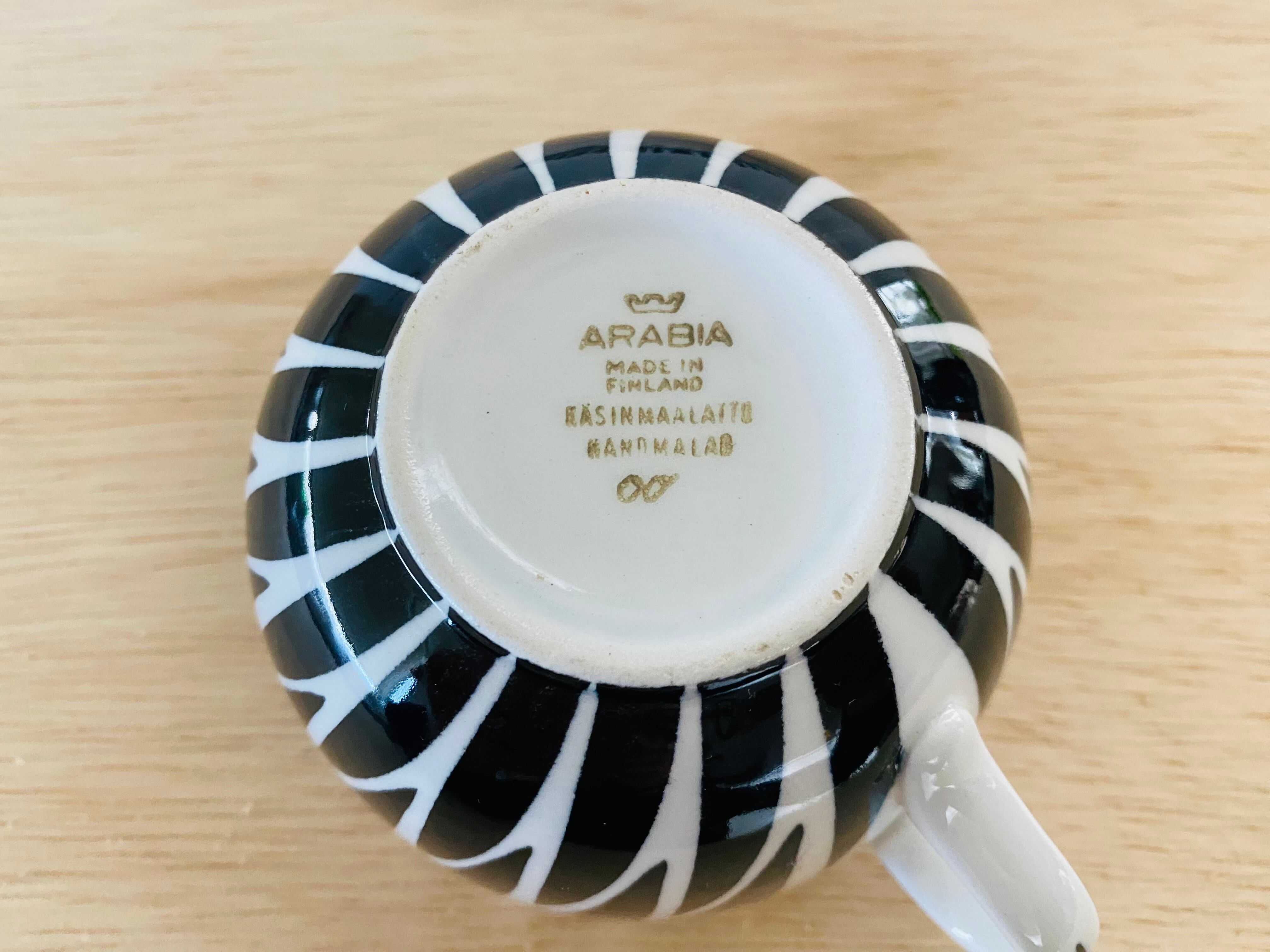 フィンランド Arabia社の陶芸家兼デザイナーToini Muona(トイニ・ムオナ)1950年代の作品です。フォルムはKaj Franck(カイ・フランク)デザインの丸みがあり女性らしいBモデルです。彼女はアラビアの芸術部門 ARABIA ART DEPARTMENTに1970年まで在籍しておりました。カップ&ソーサーにデザインすることは大変珍しいため、この作品はArabia社のヴィンテージアイテムの中でもかなりレアな存在になっています。また、アラビア社以外でも大変活躍しており、フィンランドで最も有名な陶芸家として知られているそうです。